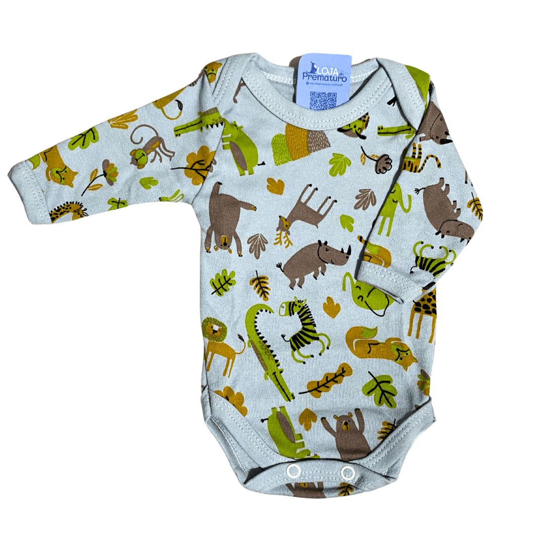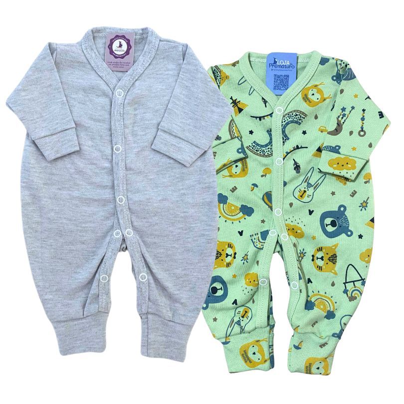 R$ 64,21 no pix (10% OFF) ou em 3x de R$ 23,78 s/jurosKit Macacão Prematuro Botão Pé Reversível 2 Peças Selva Verde Cinza