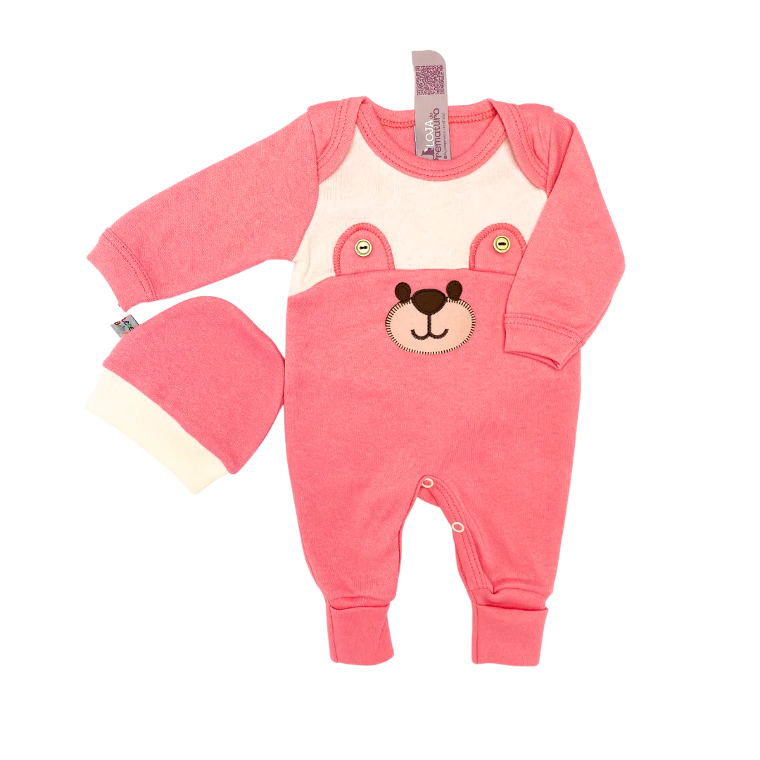 Conjunto Prematuro Macacão Pé Reversível e Gorro em Suedine Coral