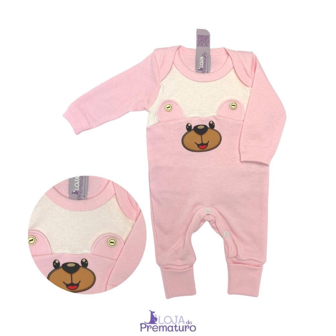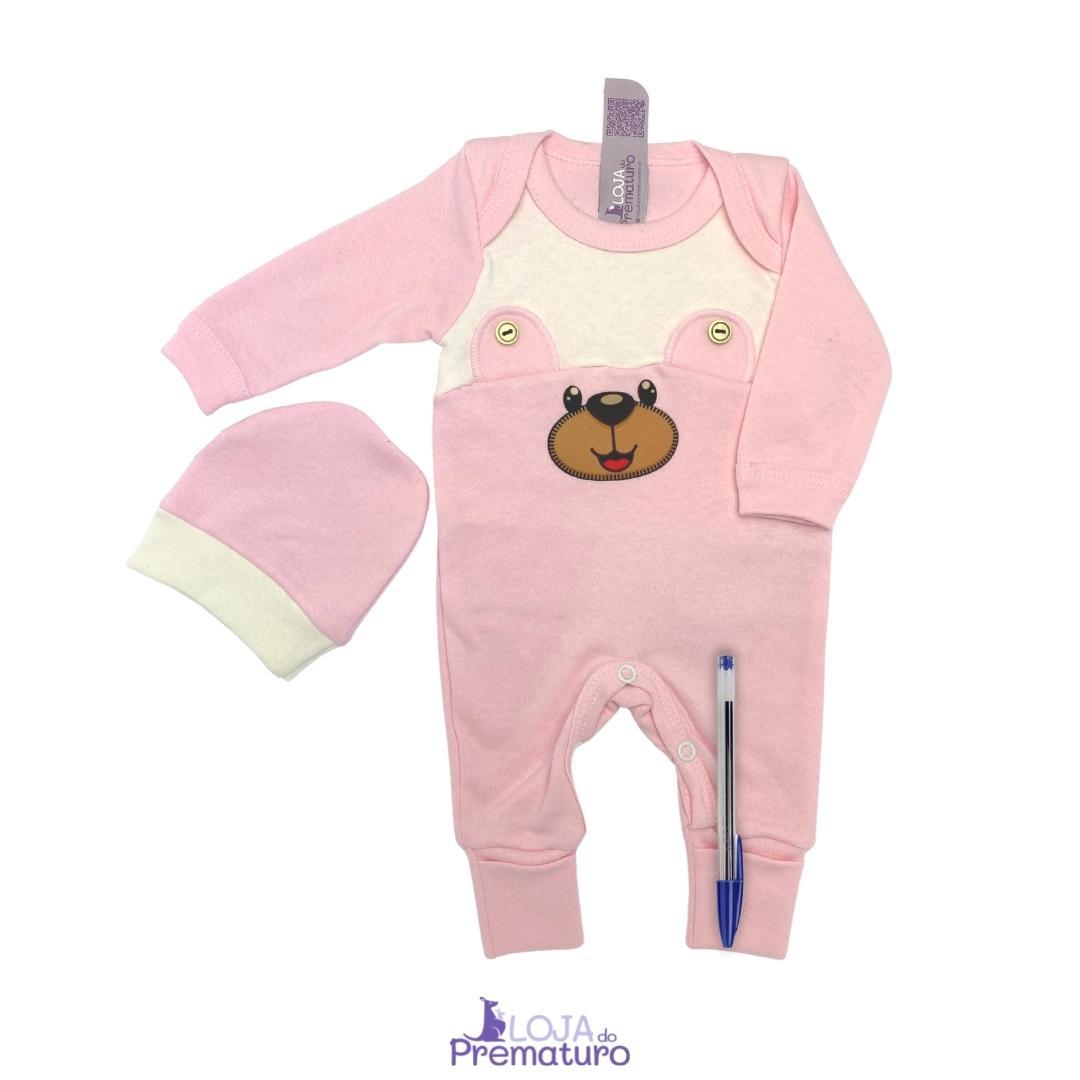 Conjunto Prematuro Macacão Pé Reversível e Gorro em Suedine Rosa