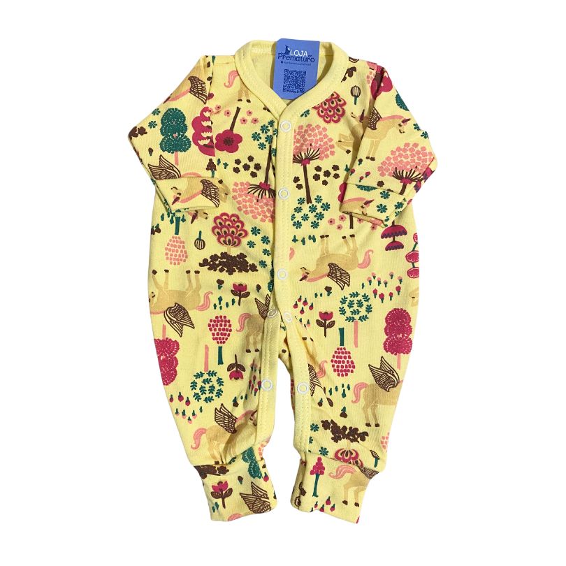 Kit Macacão Prematuro Botão Pé Reversível 2 Peças Jardim Amarelo e Rosa