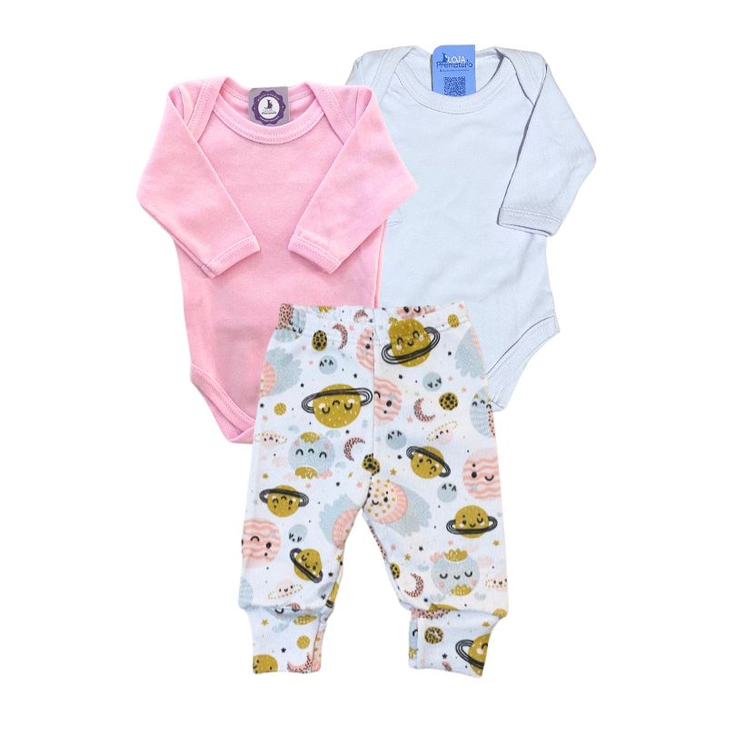 Kit Prematuro 2 Bodies e 1 Culote 100% Algodão Planetas Branco e Rosa