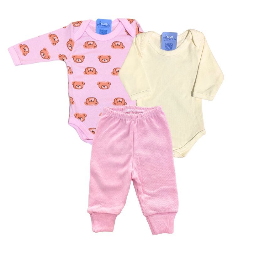 Kit Prematuro 2 Bodies e 1 Culote 100% Algodão Urso Rosa e Bege