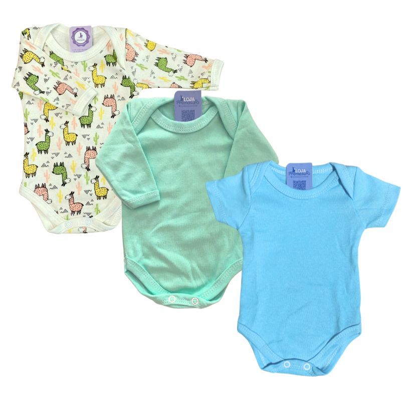 Kit Prematuro 3 Peças Body 100% Algodão Manga Curta E Longa Masculino Bege Azul Verde